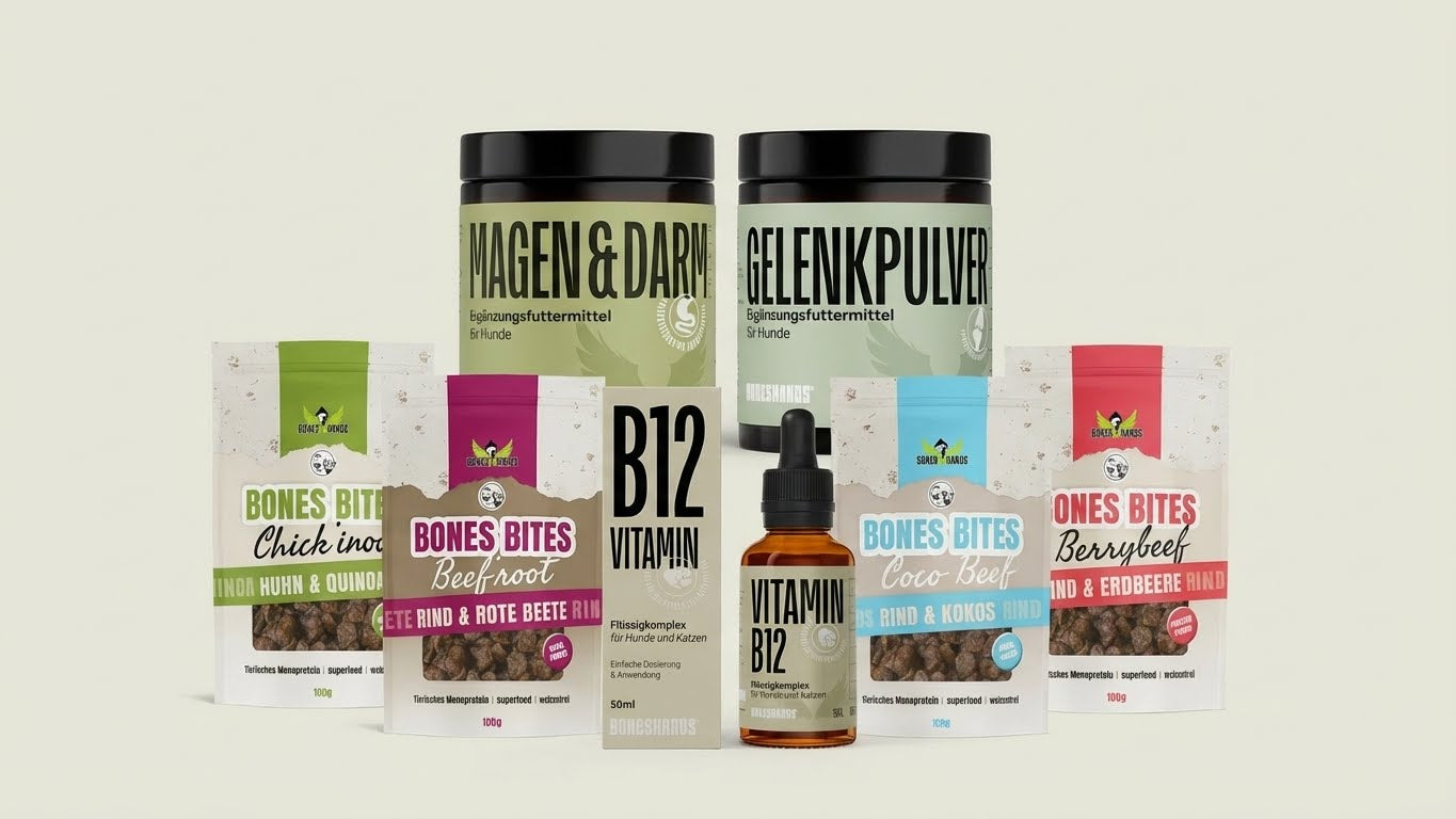 Was ist drin? Das Bundle Complete. Warum? Weil du dich nicht entscheiden musst. Du gibst alles. Du gibst Gesundheit für die Gelenke und den Bauch. Du gibst Pflege für die Haut nach dem Winterspaziergang. Und – das Wichtigste für ihn – du gibst Genuss. Eine Packung unserer Premium-Leckerlis liegt obenauf. Getreidefrei. Ehrlich. Fleischig.